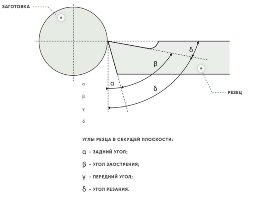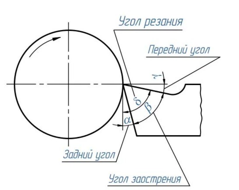 Этот угол находится между передней гранью и главной задней поверхностью резца. Он показывает, насколько прочна режущая кромка инструмента. Большие значения β означают повышенную надежность, однако при этом растет сопротивление металла резанию.