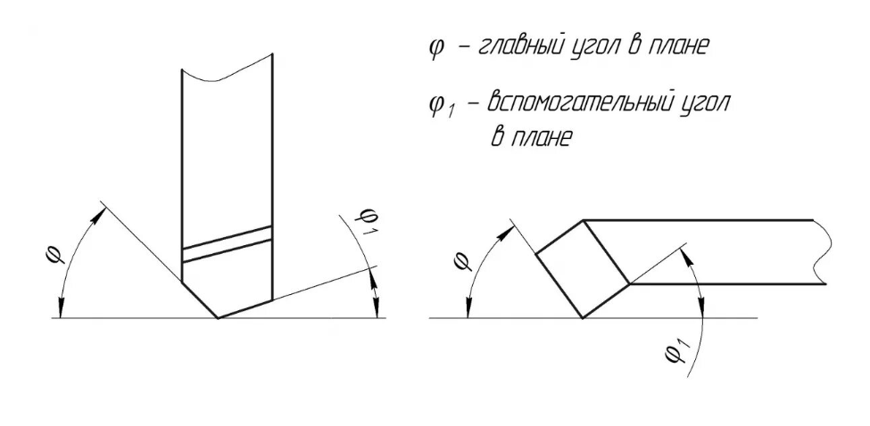Показывает, как расположена проекция основной режущей линии относительно направления подачи суппорта. Влияет на сечение срезаемого слоя и распределение нагрузок. При черновом точении применяют φ = 30-45°, для финишной обработки — 60-90°.