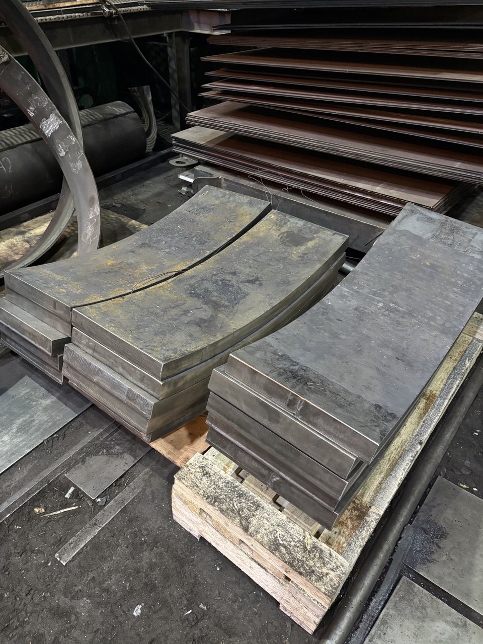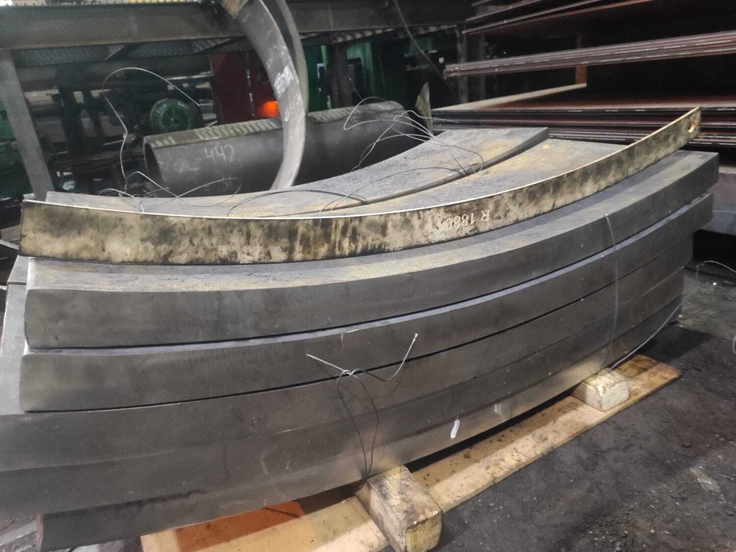 Произвели для Заказчика гибку сегментов из стали 09Г2С толщиной 60 мм. согласно ТЗ. Всего было согнуто 20 сегментов по 10 каждого вида. Один сегмент имеет внутренний радиус 1880 мм, второй сегмент имеет внутренний радиус 1225 мм. Допуск на радиусный размер 4 мм, что достаточно жестко для гибки таких толщин. Мы с данной задачей справились успешно.