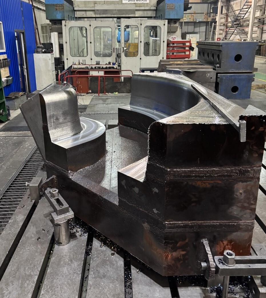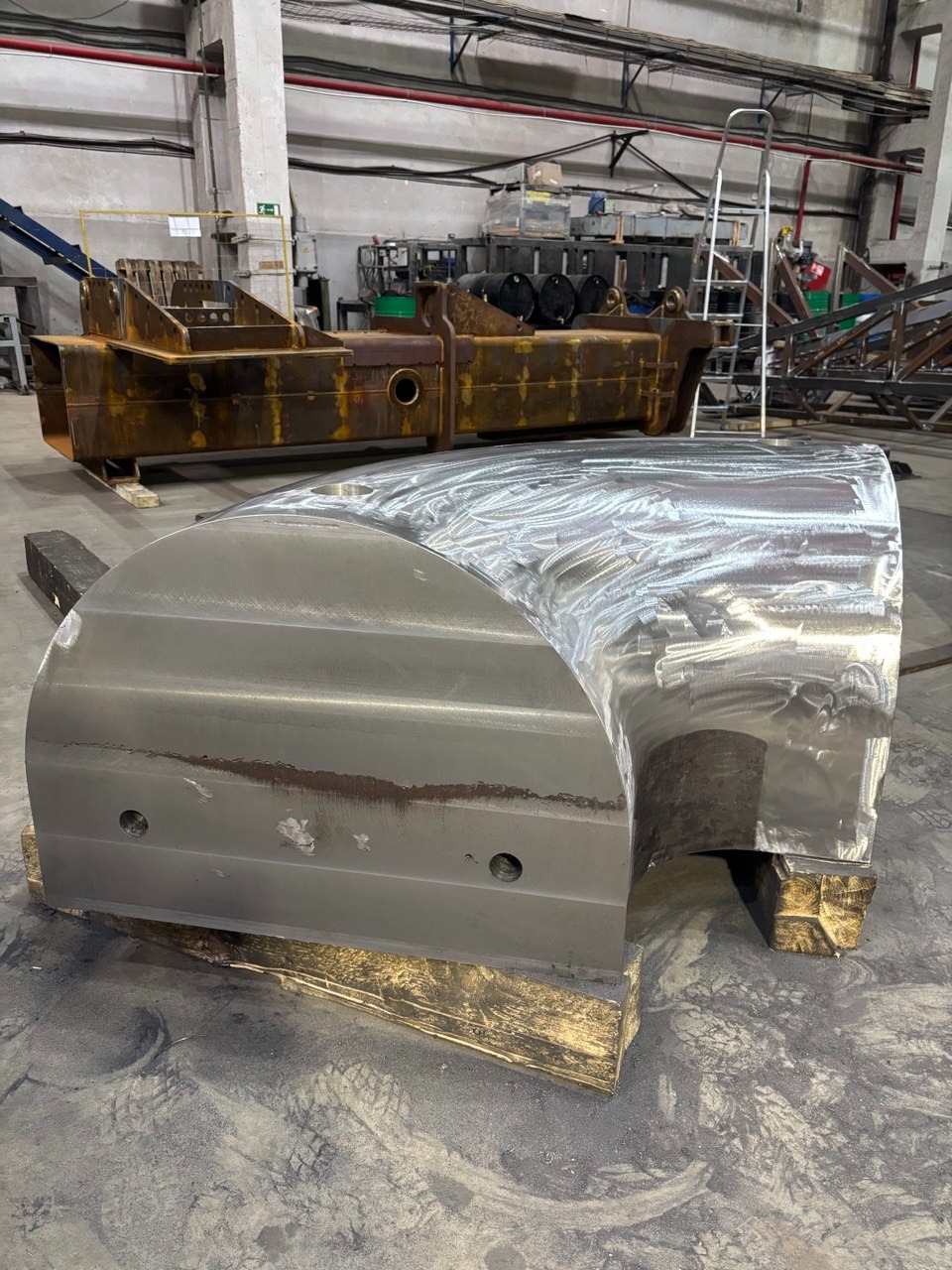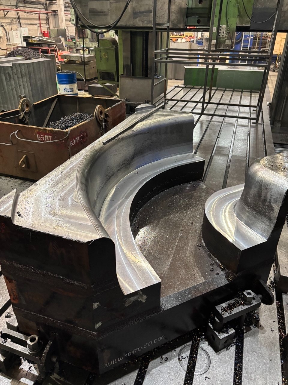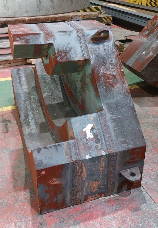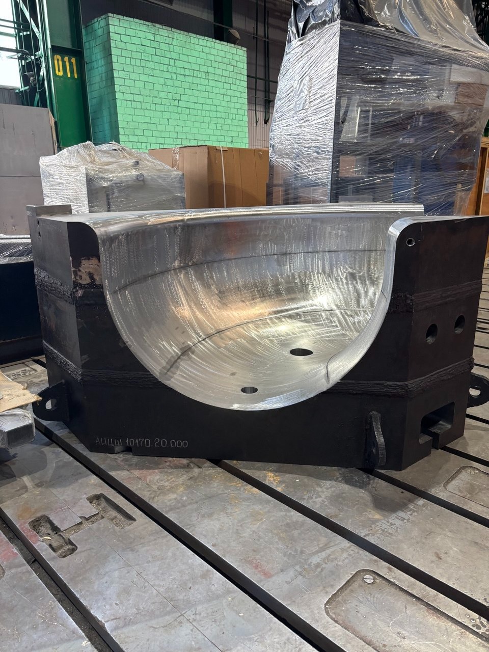 Масса заготовки для пуансона — около 4,8 тонны, для матрицы cha— примерно 6,7 тонн. Оба изделия были изготовлены из давальческого материала — сваренных листов металла толщиной 280 мм. Как выглядели заготовки до и после сварки, можно увидеть на фото ниже: