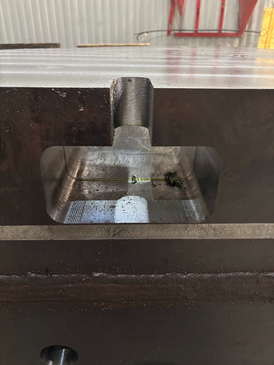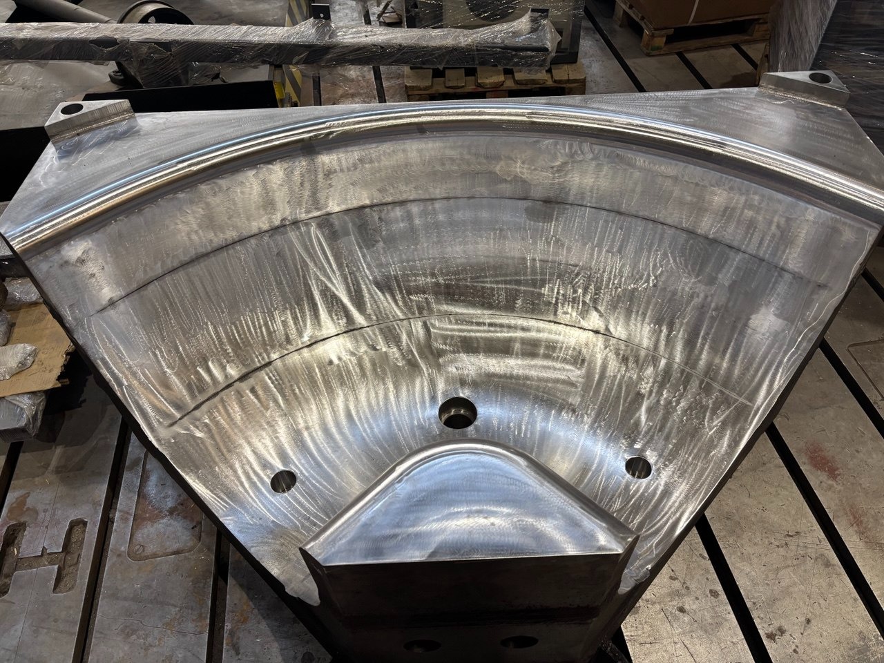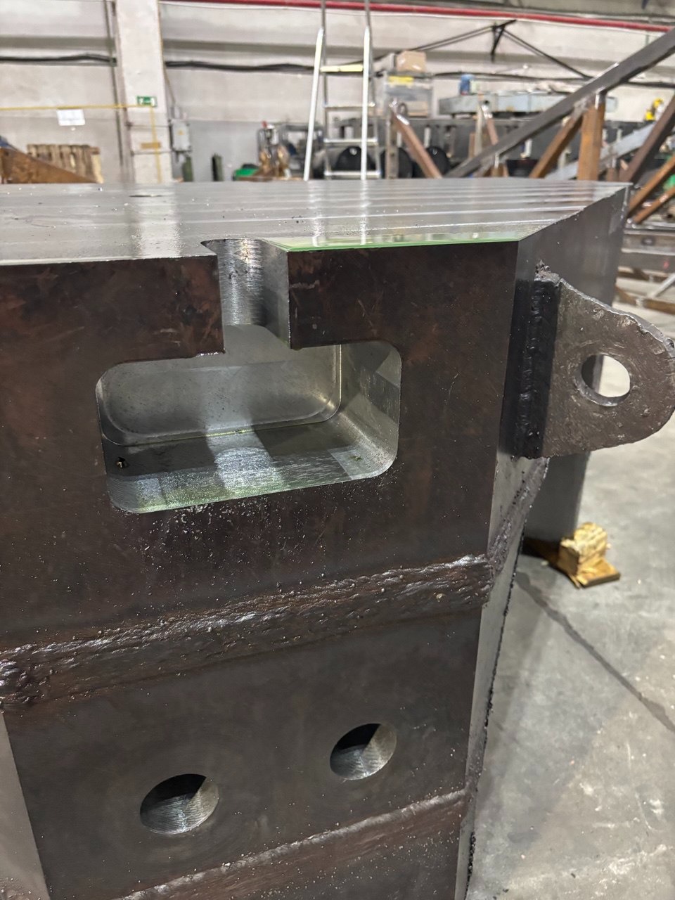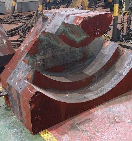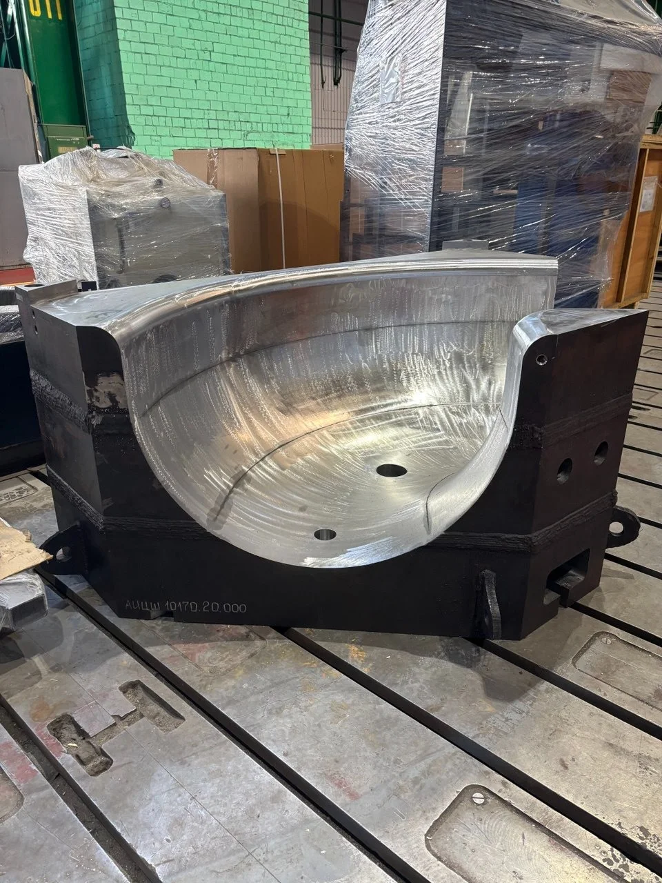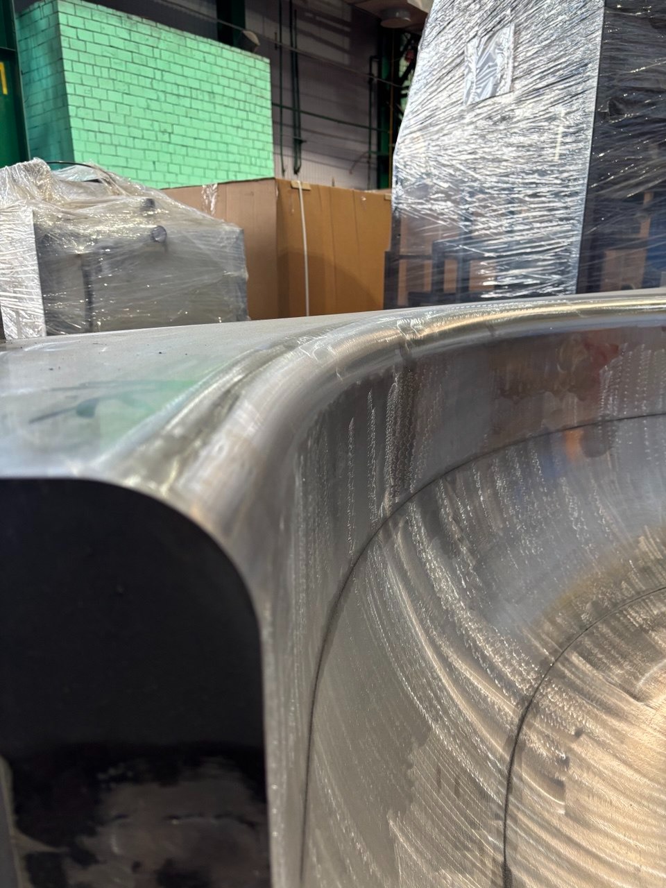 Масса заготовки для пуансона — около 4,8 тонны, для матрицы cha— примерно 6,7 тонн. Оба изделия были изготовлены из давальческого материала — сваренных листов металла толщиной 280 мм. Как выглядели заготовки до и после сварки, можно увидеть на фото ниже: