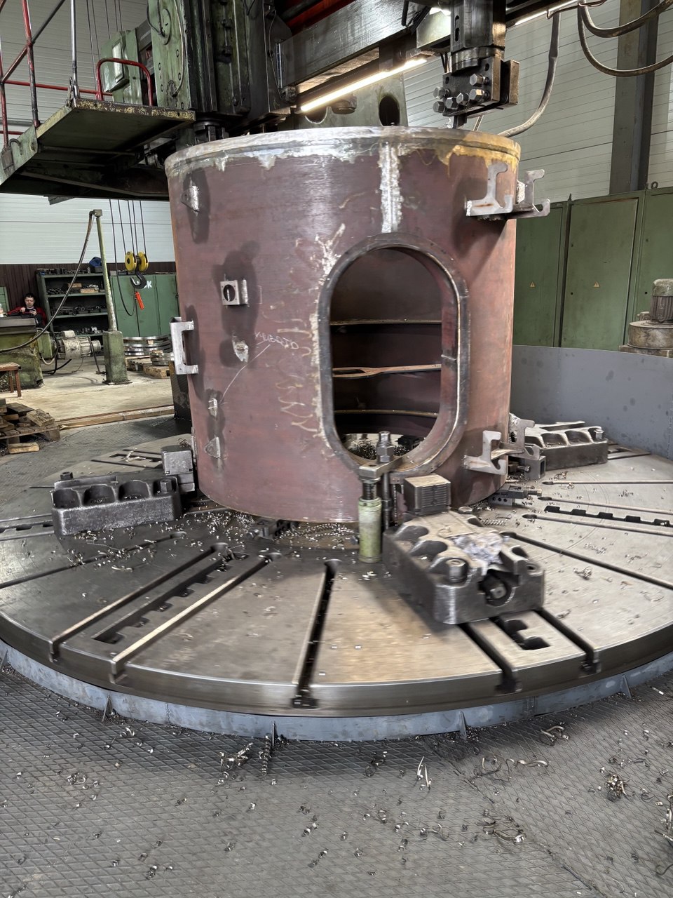 Как раз мы поделимся процессом токарно-карусельной обработки нескольких деталей, которые можно отнести к отрасли тяжелого машиностроения. Детали относятся к крановому оборудованию. Вес данных деталей от 1000 до 1500 кг. Габариты деталей: высота от 1650 мм до 1800 мм, диаметры деталей от 1470 мм до 1640 мм. Обрабатываем мы данные детали на токарно-карусельном станке с планшайбой 4 метра.